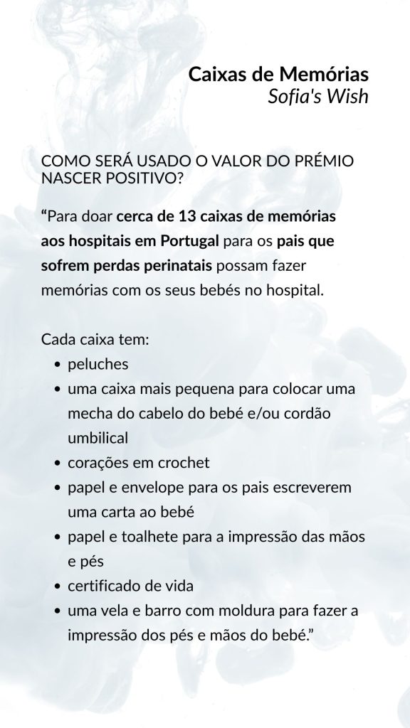 A Sofia’s Wish é um projecto sem fins lucrativos e o projecto caixa de memórias consiste em doar caixas de memórias aos hospitais em Portugal para os pais que sofrem perdas perinatais possam fazer memórias com os seus bebés no hospital.