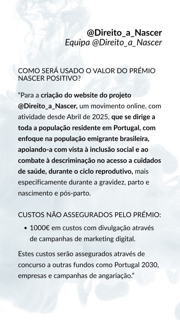O projeto @Direito_a_Nascer é um movimento online, com atividade desde Abril de 2025, que se dirige a toda a população residente em Portugal, com enfoque na população emigrante brasileira, apoiando-a com vista à inclusão social e ao combate à descriminação no acesso a cuidados de saúde, durante o ciclo reprodutivo,mais especificamente durante a gravidez, parto e nascimento e pós-parto.